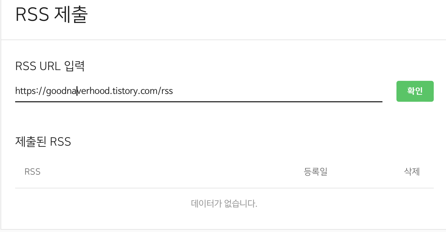 내 티스토리주소/rss 이렇게 적어주시고 확인을 눌러주세요.