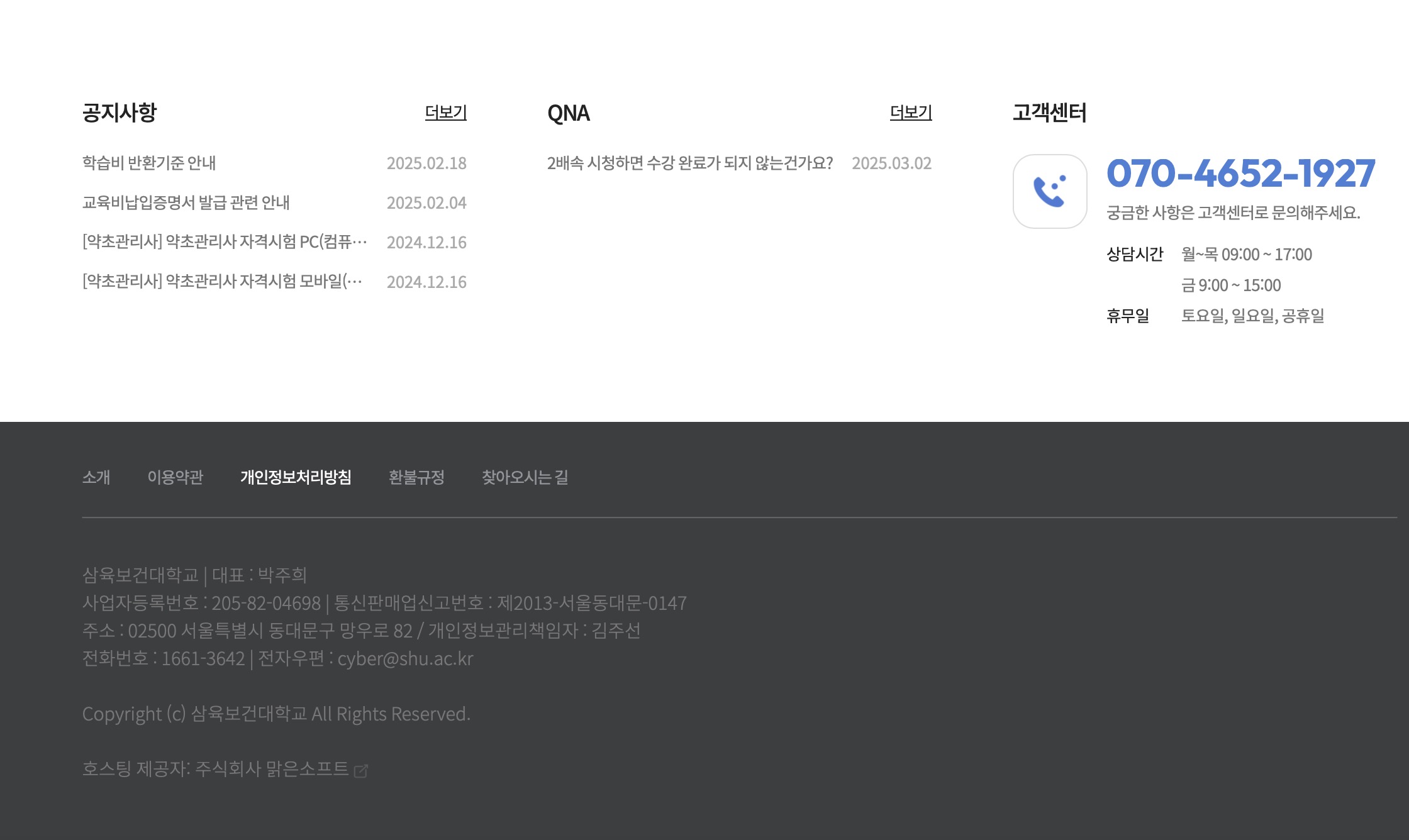 삼육보건대학교 사이버지식교육원 (https://hub.shu.ac.kr/main/index.jsp)은 다양한 온라인 교육 과정을 통해 학습자들에게 전문 지식 습득과 자격증 취득의 기회를 제공하는 플랫폼입니다. 이 시스템은 수강신청, 마이페이지, 커뮤니티 등 사용자 중심의 기능을 갖추고 있으며, 약초관리사나 웰다잉강사지도자 등 특화 과정으로 차별화된 교육 콘텐츠를 지원합니다.