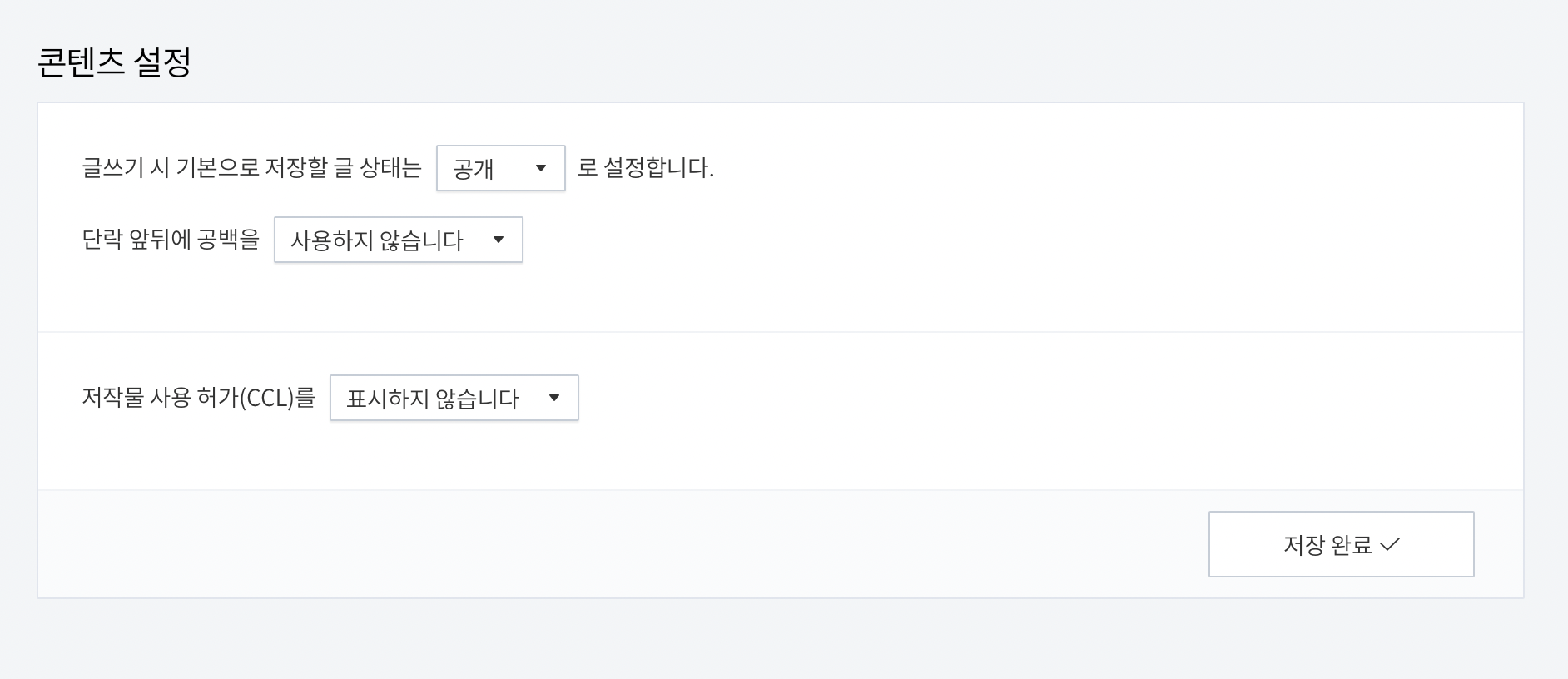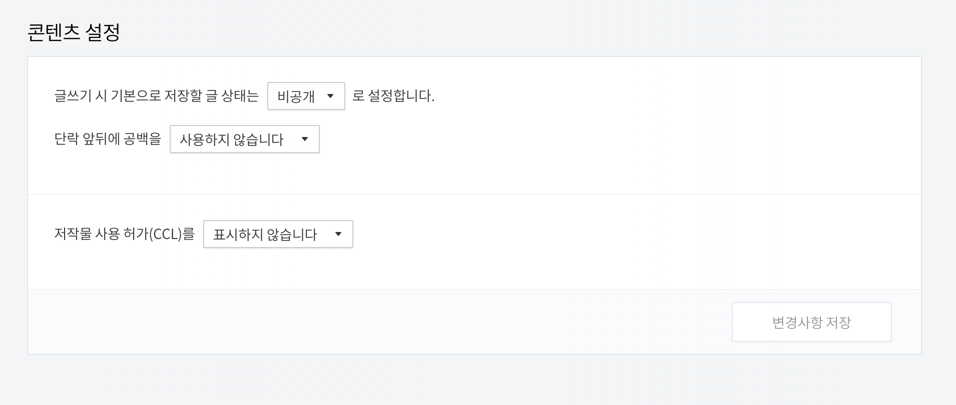 콘텐츠 설정에서 글쓰기 시 기본으로 저장할 글 상태가 처음에 비공개로 설정되어 있는데